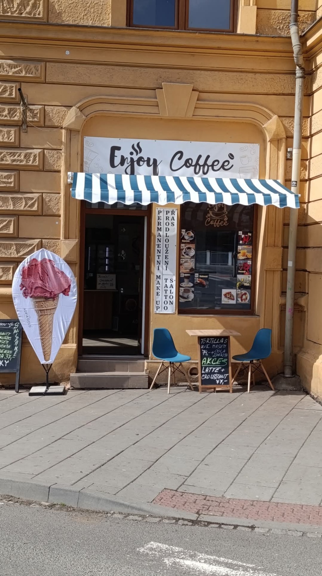 "V EnJoy Caffee u Náplavky si můžete vychutnat nabídku kvalitní kávy, domácích snídaní, sladkého pečiva, zmrzliny a osvěžujících drinků.